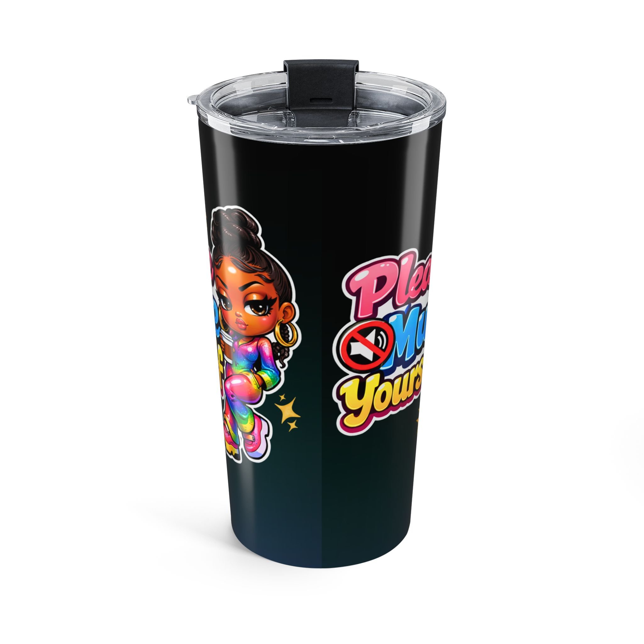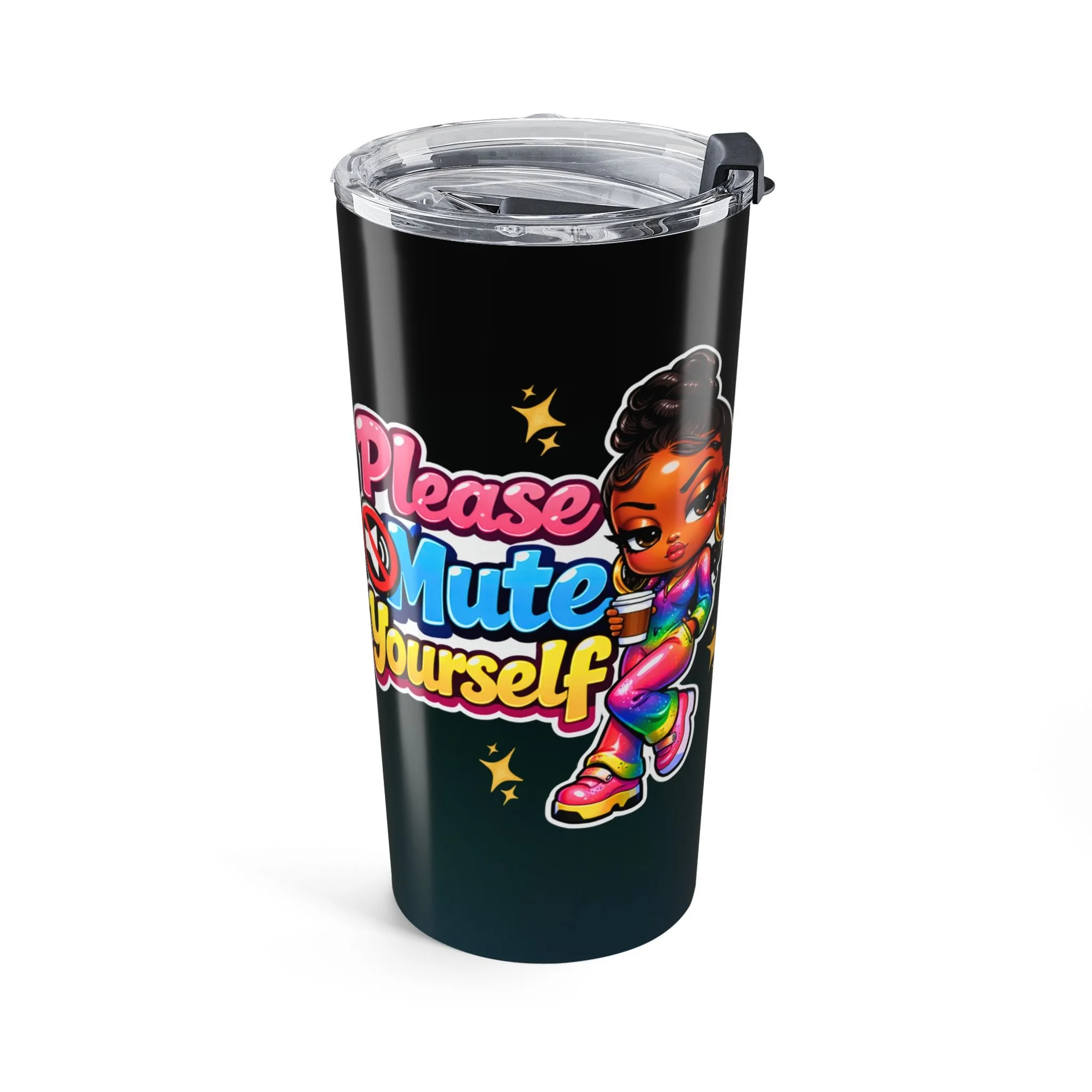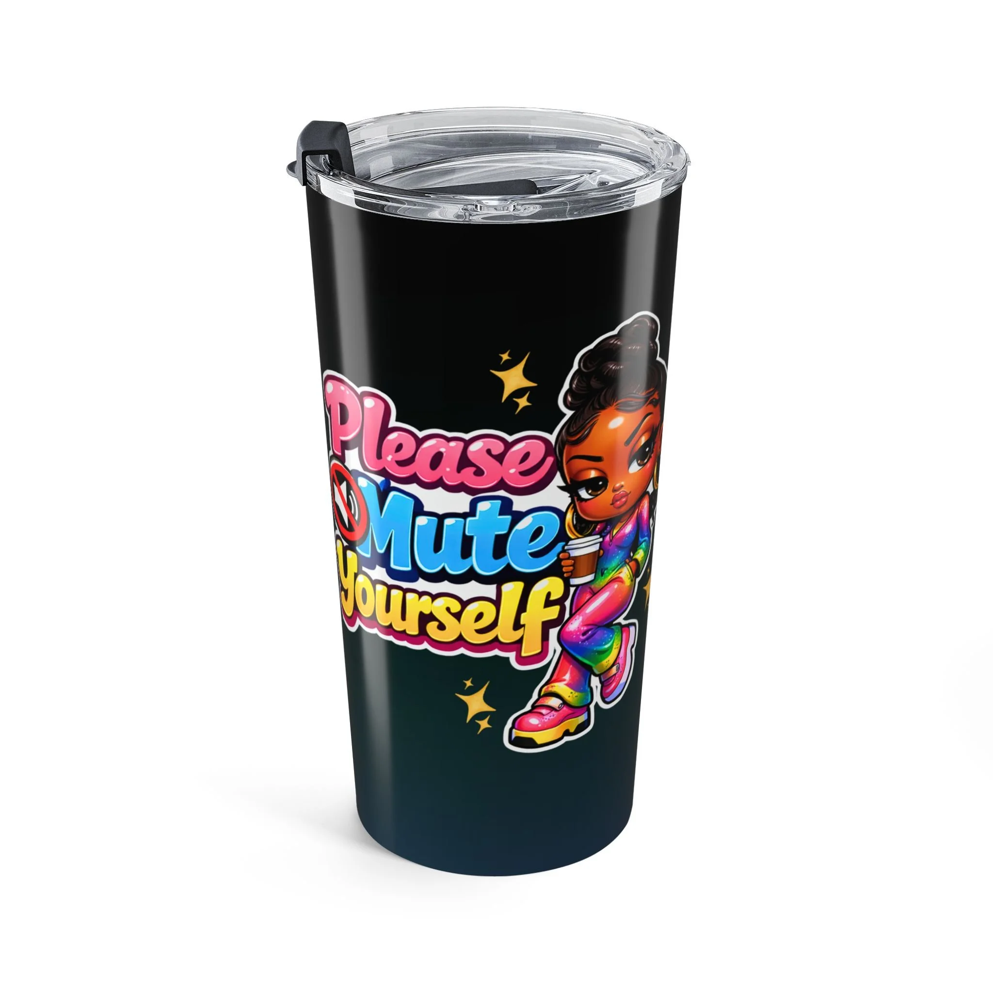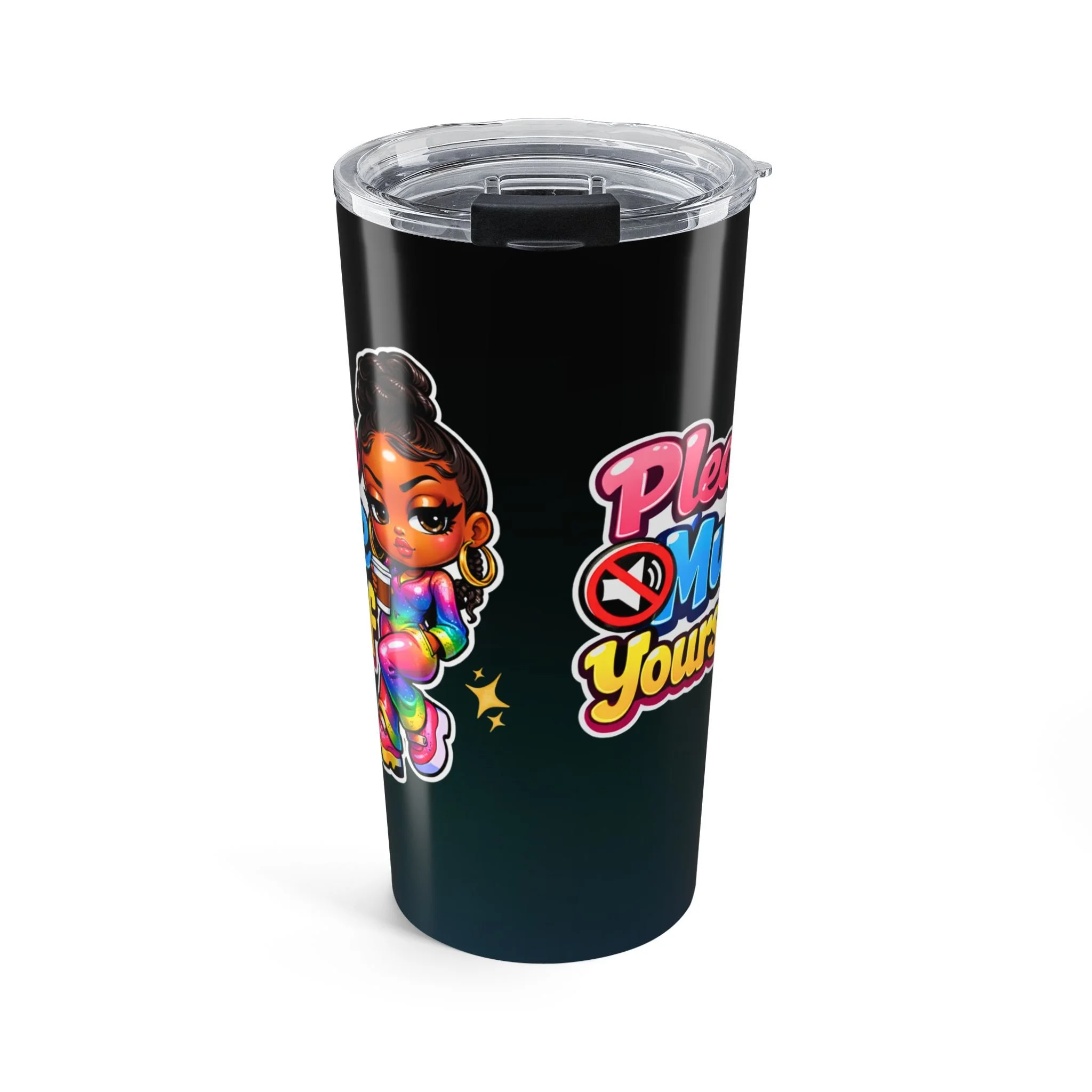 Sip with a little attitude and a lot of color. This 20oz stainless steel tumbler keeps drinks at the right temperature while showing off a bold, glossy wraparound design — a bright, sassy character and playful lettering that reads like a confident reminder to set boundaries and hold your space. The clear push-on lid with a rubber gasket seals in warmth or chill, and the smooth rounded edges make it comfortable to hold on the go. It’s built to be used daily: durable vacuum insulation, rust-resistant steel, and a dishwasher-safe finish that keeps the artwork vibrant.